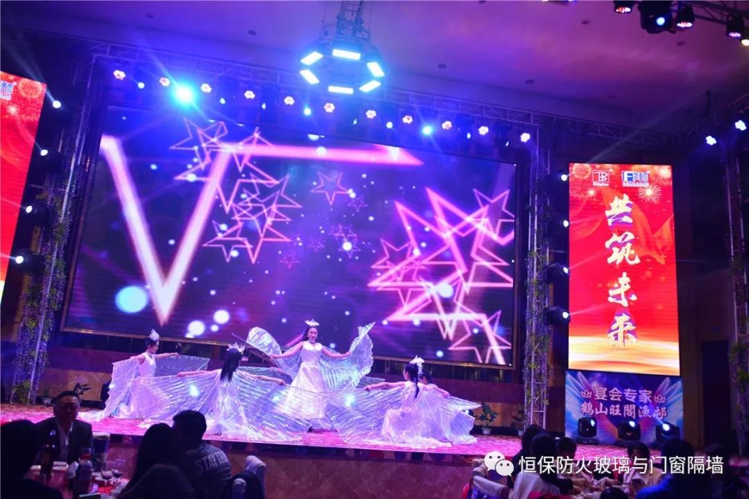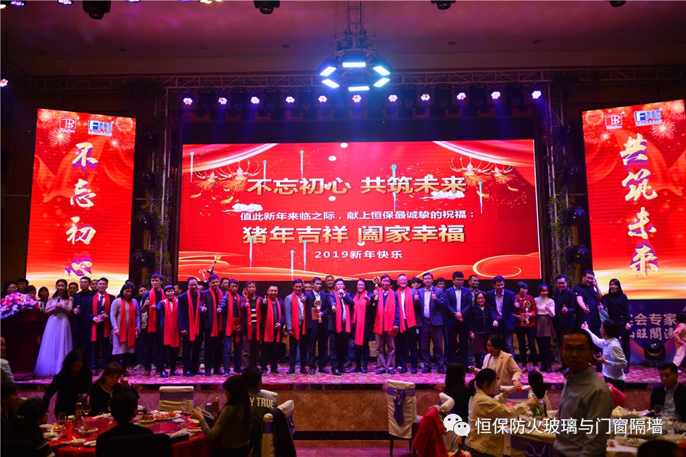 19:30分,恒保年會在鼓舞飛揚中拉開了帷幕,首先是恒保總經理陳沃林先生做年終致辭,陳總回顧了2018年所取得的成績與不足,并提出了2019年恒保要全力以赴,不忘初心,繼續奮斗,再創佳績的戰略方針。2018年是恒保跨越發展的一年。全體恒保家人,團結一心,艱苦奮斗,全力實現了公司既定的年度目標,同比各項重要指標增長逾80%。2018年我們大力引進新設備,開發新產品10多項,產品通過國家檢測20多項 ,至此,恒保出品已擁有37個3C認證,158份檢驗報告,成為行業內公認通過國家檢驗、認證最多的防火玻璃門窗企業;2018年在行業各類權威獎項評比中,榮獲“全國鋁門窗幕墻展 年度星品獎”、榮獲“新玻網 門窗玻璃十強企業”、陳沃林總經理榮獲鶴山市工商聯系統“工匠之星”稱號、陳沃林總經理榮獲第五屆中國玻璃行業“玻璃工匠”稱號、榮獲第三屆建筑門窗金軒獎“最具創新力配套產品”、榮獲第三屆建筑門窗金軒獎“最具發展潛力企業”、榮獲中國門窗幕墻行業“科技進步推動獎”等十多項獎項。2019年我們將持續優化各部門管理,提高員工工作技能、提高生產管理水平、提高生產效率、提高綜合管理能力,減少物料損耗,減少出錯率。加強精密型材、新型防火門窗的開發,滿足不同客戶的需求。2019年恒保上下一心、同心協力、不忘初心,共筑未來,為實現中國平安夢、世界平安夢繼續奮斗!