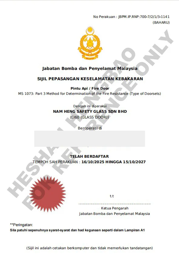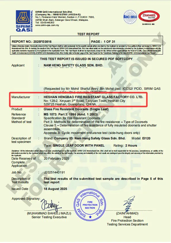 喜訊:恒保與馬來西亞南興玻璃集團共同研究開發EI60和EI120玻璃防火門帶間墻系統,并于馬來西亞科技創新與產業研究院(SIRIM Berhad)順利通過SIRIM認證。至此,恒保成為第一個EI120玻璃防火門帶間墻系統產品通過SIRIM認證的公司。恒保和南興玻璃集團共創輝煌,迎來新的里程碑!